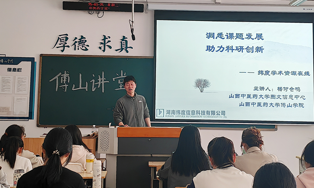 3月25日上午,pp电子官方网站入口在图文信息中心906教室举办“傅山讲堂”系列学术讲座第七十二期。湖南纬度信息科技有限公司产品经理杨付仓鸣以《洞悉课题发展 助力科研创新——纬度学术资源在线数据库介绍》为题展开分享。