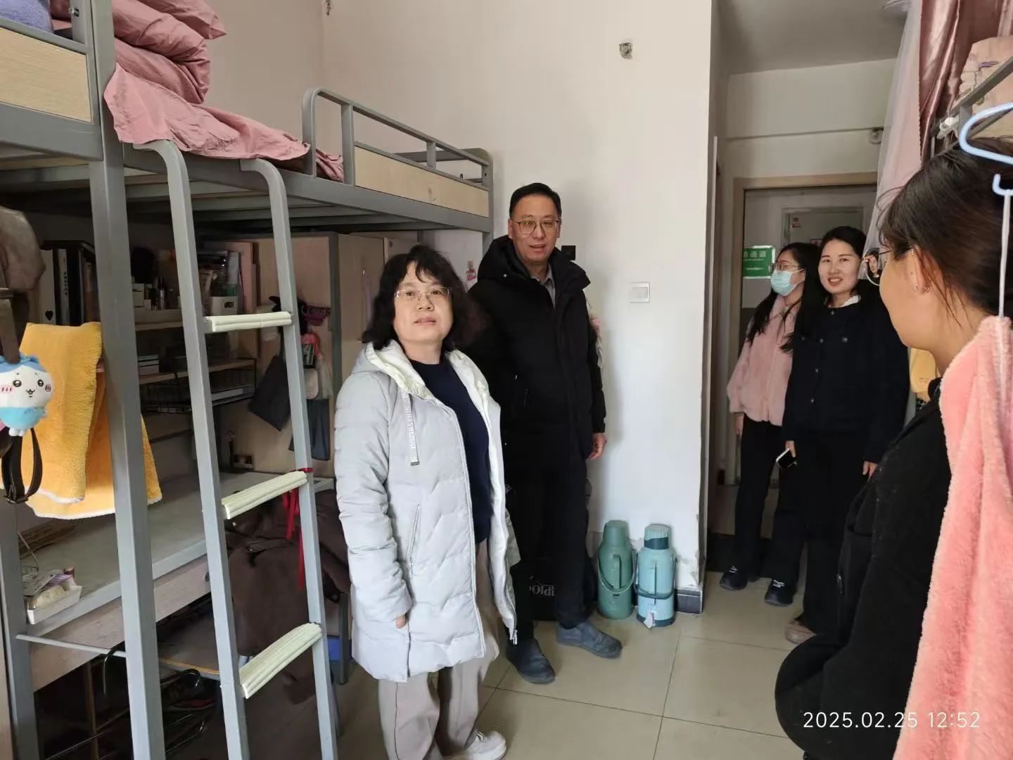 新学期,新气象。为深入了解学生返校后的情况,排查宿舍安全隐患,解决学生实际困难和需求,传递学院教师关怀和师生情谊,2月25日学院党政领导、辅导员一行集体走进学生宿舍,开展走访慰问活动。