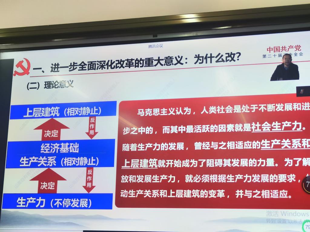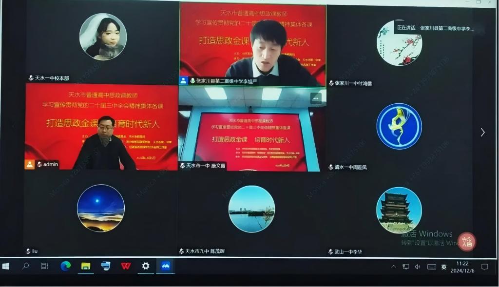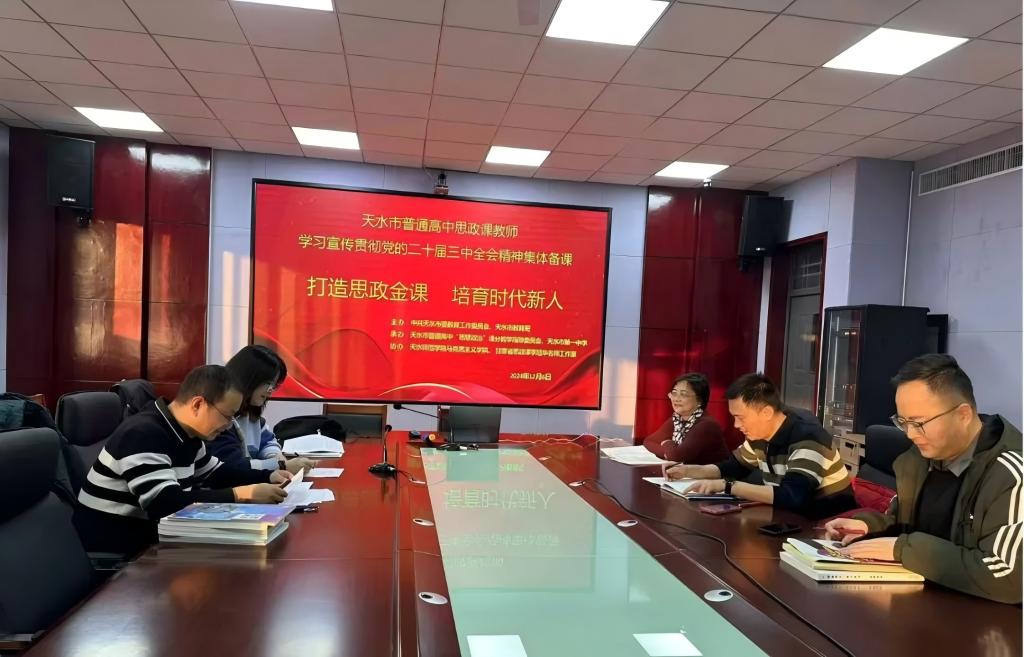 为深入学习宣传贯彻党的二十届三中全会精神,全面落实全国教育大会精神,推进天水市大中小学思政课一体化建设,12月6日上午,天水市普通高中思想政治课教师开展了学习宣传贯彻党的二十届三中全会精神集体备课会。会议由中共天水市委教育工作委员会、天水市教育局主办,天水市普通高中“思想政治”课分教学指导委员会、天水市第一中学承办,新葡萄8883官网AMG官网新葡萄8883官网AMG官网与甘肃省思政课李旭华名师工作室协办,会议由天水市普通高中“思想政治”课分教学指导委员会主任、天水市一中副校长宋劼主持。会议主题是“打造思政金课,培育时代新人”,采用腾讯会议在线直播形式进行,天水市第一中学思政课教师线下参会,其他学校设立分会场组织思政课教师线上线下结合参会,全市共计三百余名普通高中思政课教师参会。
