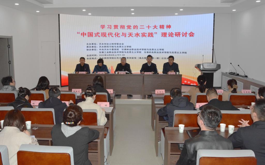 4月8日,由天水市社科联主办,新葡萄8883官网AMG官网新葡萄8883官网AMG官网承办,中共天水市委党校、甘肃林业职业技术学院新葡萄8883官网AMG官网、甘肃工业职业技术学院新葡萄8883官网AMG官网、甘肃机电职业技术学院新葡萄8883官网AMG官网协办的学习贯彻党的二十大精神“中国式现代化与天水实践”理论研讨会在新葡萄8883官网AMG官网红色文化教育体验馆召开。驻市各高校新葡萄8883官网AMG官网、市委党校社科理论方面的30多名专家学者参加研讨会。天水市委宣传部副部长王刚出席会议并讲话,会议由新葡萄8883官网AMG官网党总支书记刘建军主持。
