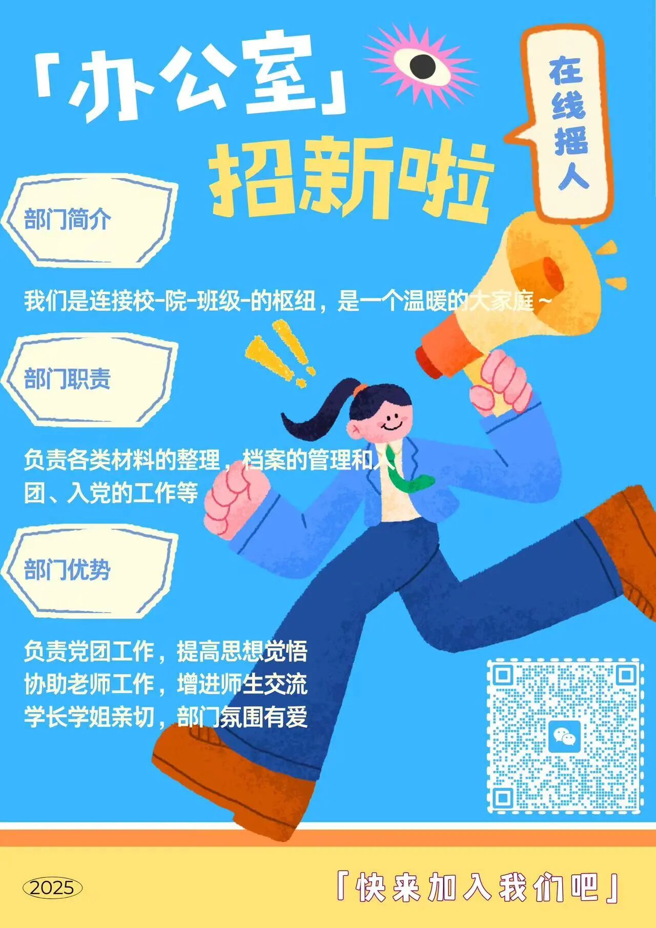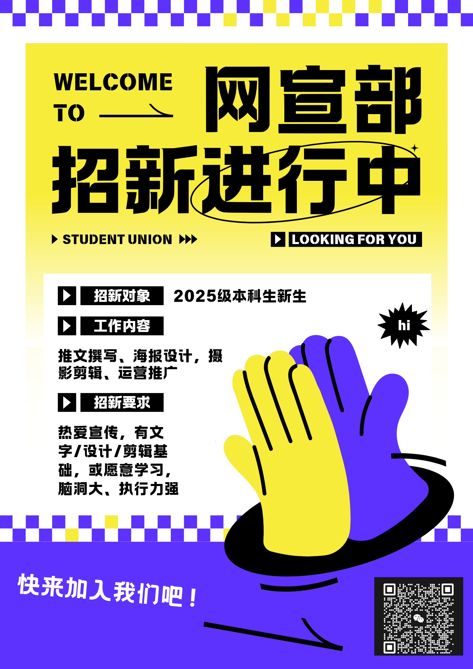 pp电子官方网站入口网宣部招新啦!速来集合~宝子们看这里!✨我们负责学院宣传与官方平台运营,超有意思哦!加入能学推文、海报、短视频技能,还能跑活动、攒经验、拿综测加分,认识超多志同道合的小伙伴~零基础也完全OK!热烈欢迎每一位有创意的你加入,一起玩转校园宣传!