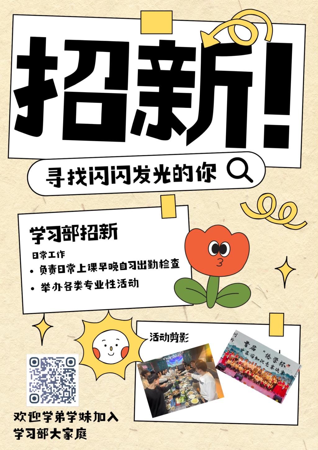 不止于“学”,更“燃”于行!打破对“学习部”的刻板印象!我们不只是“学习”的代名词,更是校园学术活力的注入者,致力于为你的大学生活注入满满“干货”与无限可能!我们负责日常查勤、教材发放、举办专业相关活动、协助老师日常工作等。学习部期待你的加入,让我们携手并肩,共赴一场精彩的成长之旅,书写属于我们的青春华章!