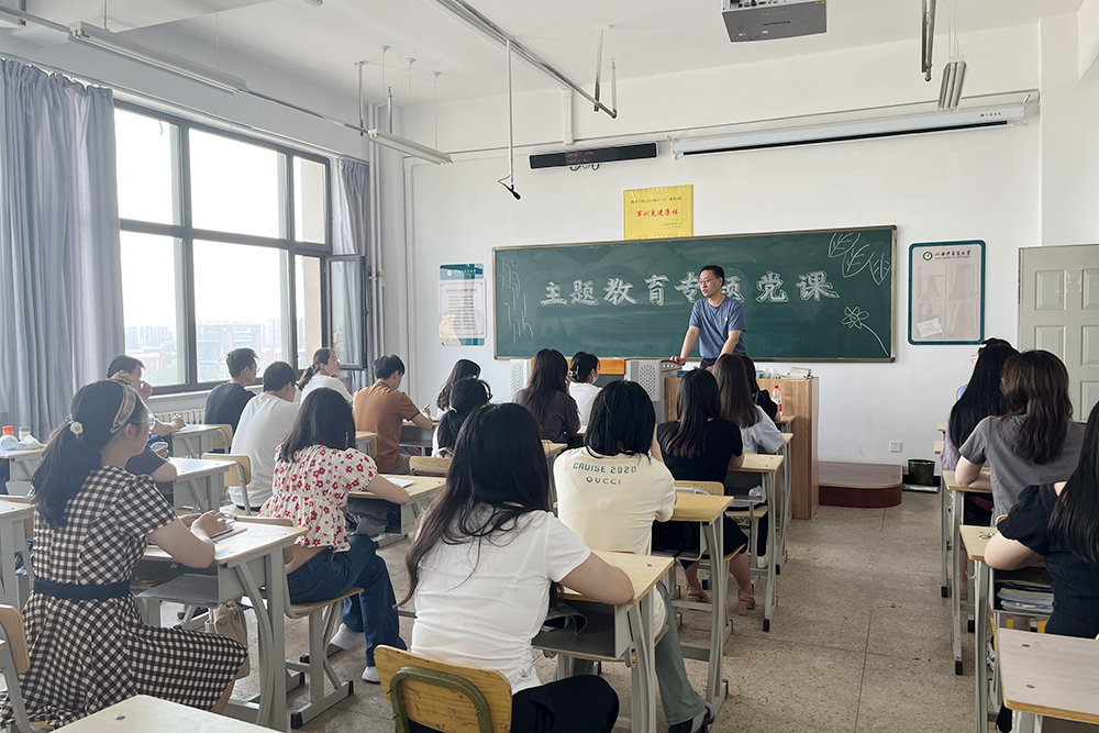 6月16日下午,pp电子官方网站入口党总支组织开展学习贯彻习近平新时代中国特色社会主义思想主题教育专题党课。党总支书记李培硕主讲,学院全体党员以线上线下相结合的方式参加。