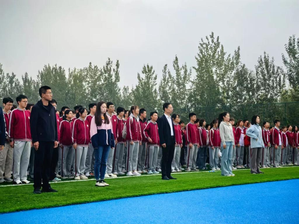 伴随着激昂的《义勇军进行曲》,五星红旗缓缓升空,全体师生肃立注目,向国旗行注目礼,爱国情怀在每个人心中激荡。