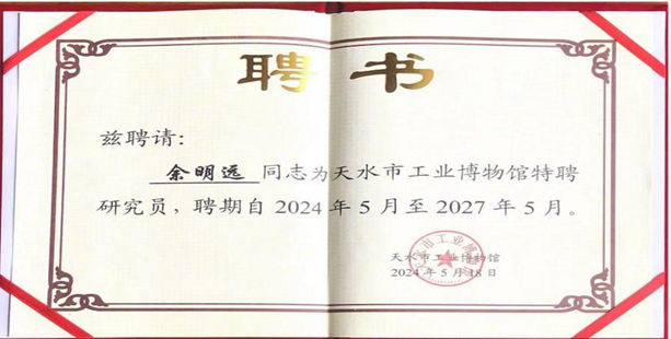 名师工作室负责人余明远教授被天水工业博物馆特聘为研究员