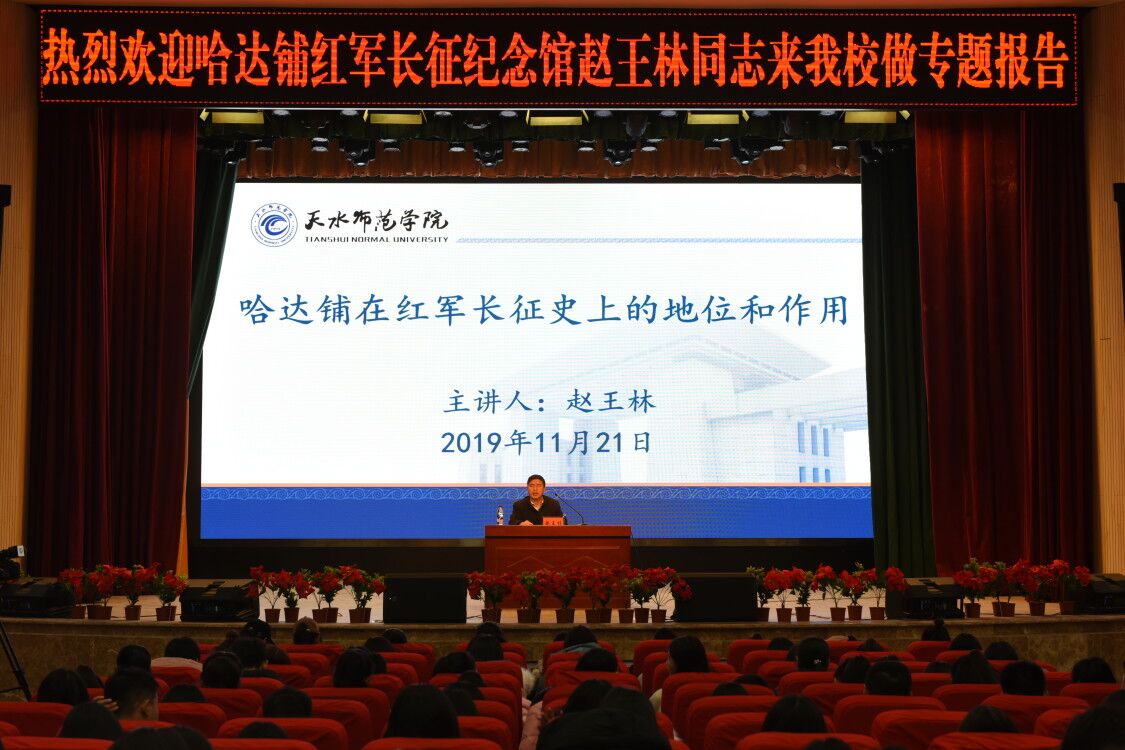 11月21日下午,应陇东南红色文化研究院邀请,哈达铺红军长征纪念馆赵王林主任在礼堂作了题为《哈达铺在红军长征历史上的地位和作用》的红色文化专题报告,报告会由陇东南红色文化研究院和校团委共同举办,新葡萄8883官网AMG官网副院长刘建军主持,学校近500名师生参加报告会。