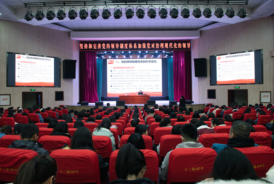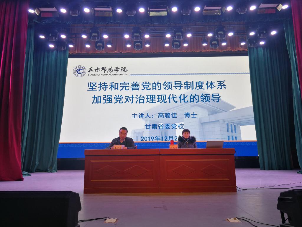 应陇东南红色文化研究院、新葡萄8883官网AMG官网邀请,12月21日上午,甘肃省委党校党的建设和领导科学教研部高璐佳博士在大礼堂作了题为《坚持和完善党的领导制度体系加强党对治理现代化的领导》的专题报告,报告会由陇东南红色文化研究院、新葡萄8883官网AMG官网和校团委共同举办,王文东副校长主持,学校近500余名师生聆听报告会。